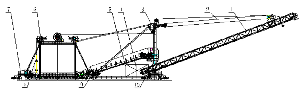 ![]() 1.皮帶機系統、2.臂架俯仰系統、3.金屬結構、4.柴油機組、5.電氣系統、6.上車道及門架、7.行走機構、8.配重系統、9.液壓系統、10.臂架回轉機構 ![]() 設備技術說明 1).工藝流程:卡車運輸物料——接料槽——上料皮帶機——轉載漏斗——臂架皮帶機——料場; 2).為了滿足環保要求,采用噴淋技術防塵.在接料槽、轉載漏斗及比較落料點處均裝置噴淋系統,起到壓塵作用.水箱設置容量為6立方米,可根據實際情況進行調整; 3).臂架皮帶機具備俯仰功能及回轉功能,定點堆放物料噸位約為4800噸,在對應4萬噸海輪時僅需要移機10多次; 4).設備自帶行走功能,采用全驅動式行走方式,前后車輪可以同時旋轉也可以分開旋轉.使得裝料機能夠實現前進后退,左右平移,原地回轉等多自由度動作,可以在堆料過程中實現快速移機; 5).司機室設置在設備的前方, 控制動作時視野開闊,設備上多處地方設置高清攝像頭,司機可以通過監視器即可掌握設備周圍的所有情況及設備工作情況; 6).皮帶機驅動電機,行走電機均采用變頻電機.可以根據實際裝載情況調節其運行速度; 7).設備設置雙車道上卡車,減少了卡車的等待時間,極大的工作效率; 8).使用加料車型:60噸以下卡車、10噸以下裝載車; 9).額定40噸卡車運行倒倉時間為60s,峰值期間一小時循環60次,設備有效工作效率為2400t/h;允許卡車超載到60噸,生產率為3600t/h。受清倉及煤炭種類影響設備平均時效生產率1400t/h。